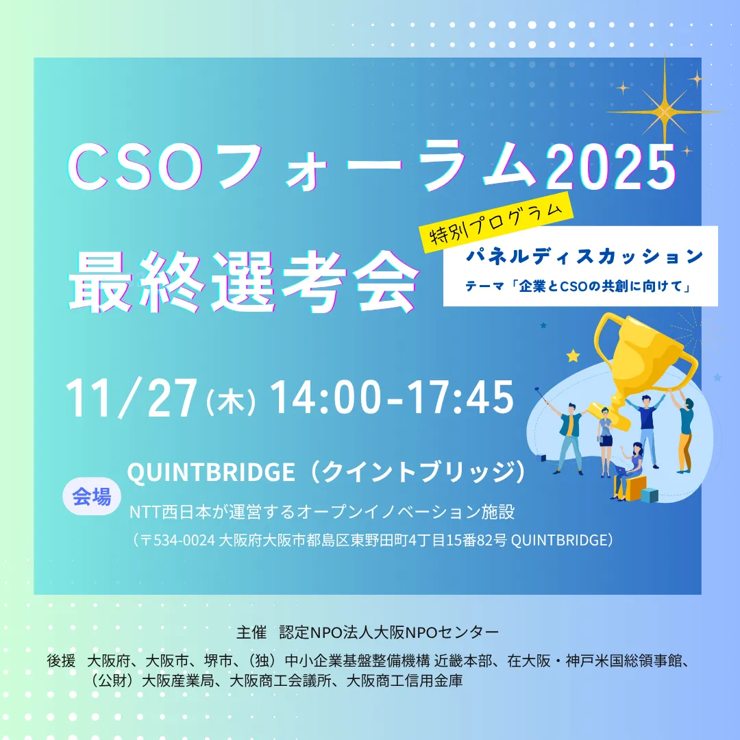 2025年11月27日、社会課題に取り組む個人や団体が一堂に会する「第28回CSOフォーラム2025」の最終選考会がQUINTBRIDGEで開催されます。主催は大阪NPOセンターで、社会的な問題解決に向けた活動や事業を評価し、表彰する場となります。これまでに3,000以上の応募者が支援を受けたこのフォーラムは、情熱を持った社会起業家たちの集まりです。