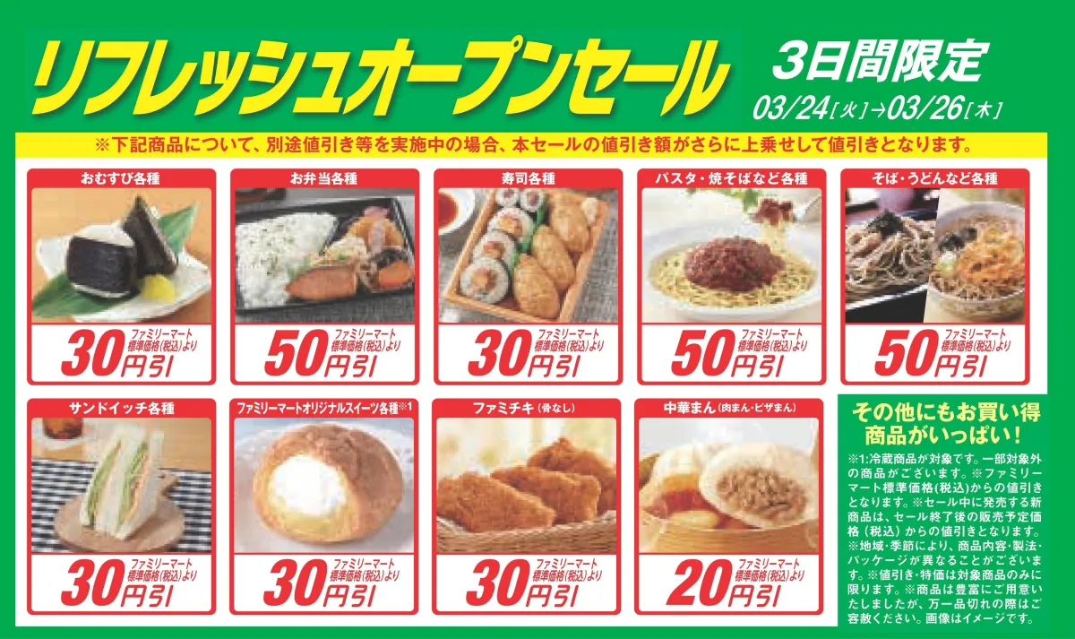 さらに、リニューアルオープンを祝して、3月24日(火)から3月26日(木)までの3日間にわたり、特別セールが実施されます。このセールでは、各種おむすびが30円引き、お弁当は50円引き、寿司が30円引き、そして麺類も50円引きと、大変お得な価格で提供されます。ファミリーマートオリジナルスイーツやファミチキ、中華まんも値下げされるため、この期間中は見逃せません!