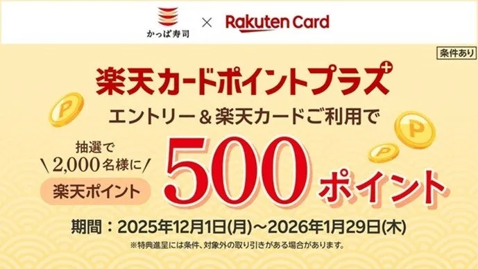 今回のキャンペーンは、楽天カード株式会社が運営する「楽天カードポイントプラス」にて行われ、抽選で2,000名様に500ポイントが当たるという嬉しい特典が用意されています。参加方法は簡単、お食事を楽しみながらエントリーするだけ。この機会に美味しい寿司を味わいながらポイントをゲットしましょう!