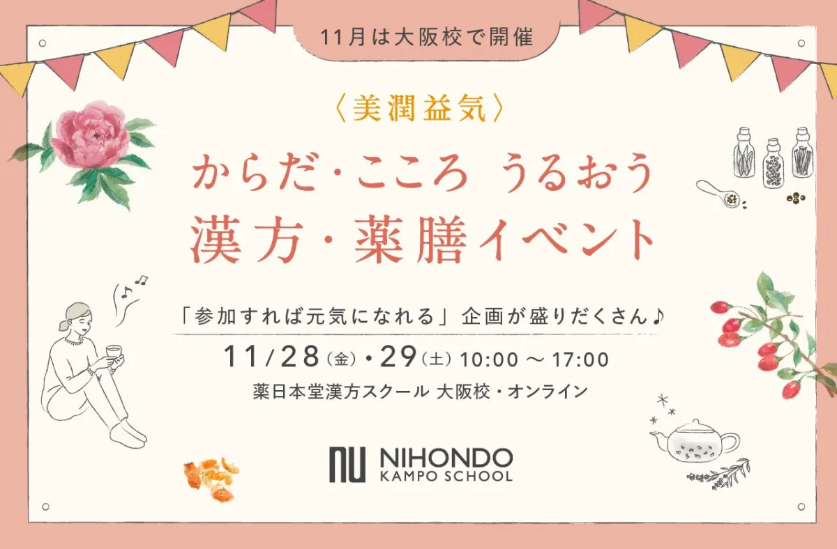 2025年11月28日(金)と29日(土)、大阪・梅田の薬日本堂漢方スクールで「からだ・こころ うるおう 漢方&薬膳イベント」が行われます。専門家による多彩なセミナーや、和漢マルシェが一堂に集まり、気軽に漢方や薬膳に触れることができる貴重なチャンスです。参加者は初心者から経験者まで楽しめる内容が揃っています。