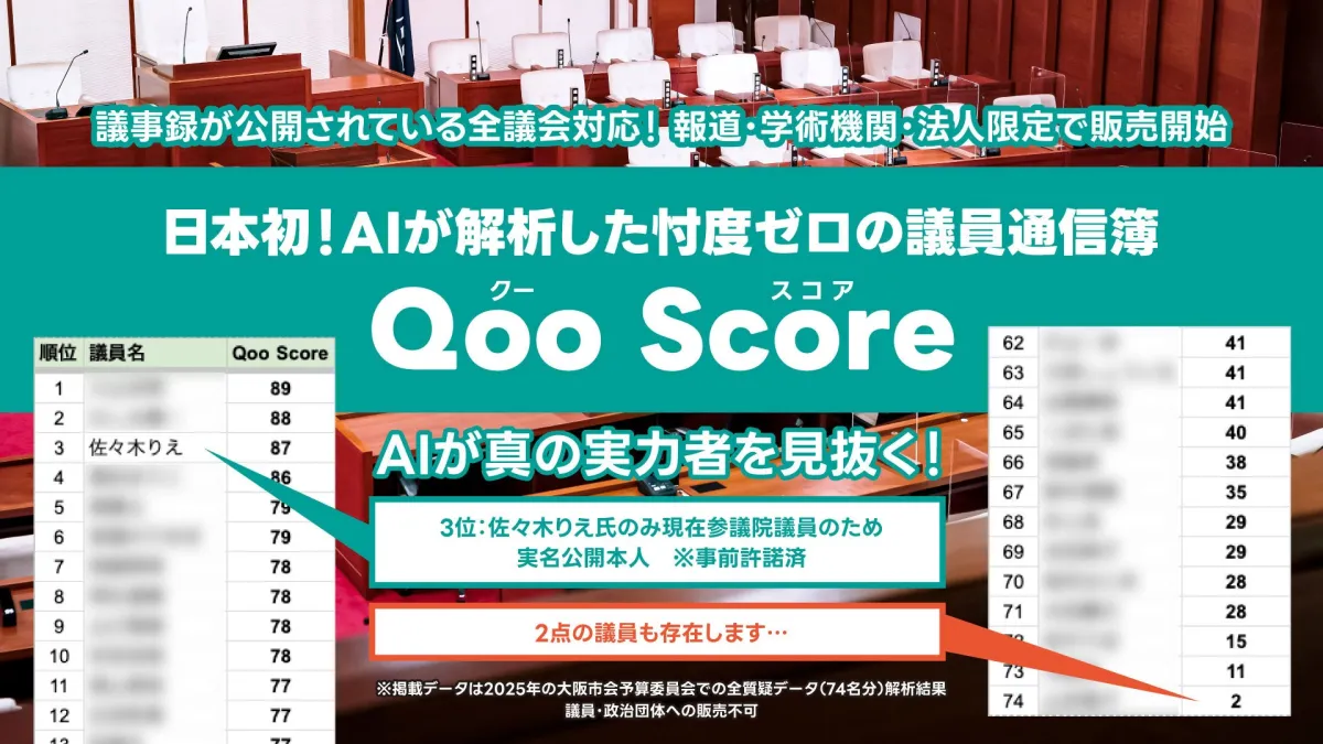 このシステムの開発にあたっては、8年間の大阪市議の経験を持つ代表が議会の「裏側」まで理解し、AIプロンプトとしてアルゴリズム化することに成功しました。これによって生まれた『Qoo Score』は、政治家への忖度を排除し、冷静かつ合理的な評価を実施します。