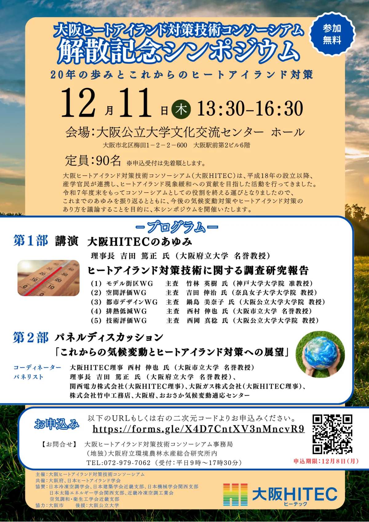 大阪では、ますます顕著になるヒートアイランド現象が人々の日常生活や健康に影響を及ぼしています。都市化と地球温暖化が進む中で、どのようにして私たちの生活環境を守っていくのかが重要な課題になっています。この度、大阪ヒートアイランド対策技術コンソーシアム(大阪HITEC)が解散することとなり、その記念として12月11日(木)にシンポジウムを開催することが決定しました。