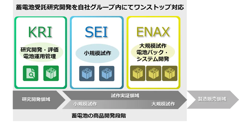 KRIは、エナックスの強力な技術を活用し、蓄電池の受託研究開発業務をワンストップで対応可能にすることを目指します。具体的には、KRIが持つ研究評価技術、劣化診断技術、加えて2019年に取得したエス・イー・アイ株式会社の小規模試作技術と合わせて、蓄電池技術のトータルソリューションを提供します。また、2030年度に向けたリチウムイオン電池の超長寿命化の取り組みも進行中であり、エナックスの試作技術を適用する計画もあります。