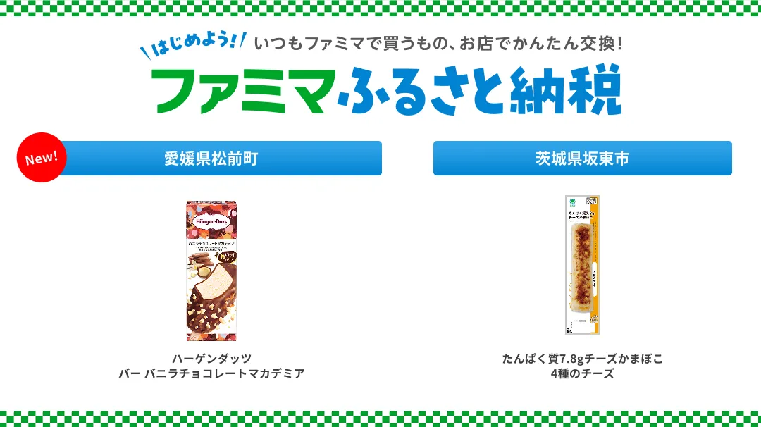 ファミリーマートが展開する「ファミマふるさと納税」に、待望の新商品が加わります。2026年4月16日(木)より、愛媛県松前町からは贅沢な「ハーゲンダッツ バー バニラチョコレートマカデミア」が、茨城県坂東市からは「たんぱく質7.8gチーズかまぼこ 4種のチーズ」が登場。どちらもおやつやおつまみにぴったりの逸品です。