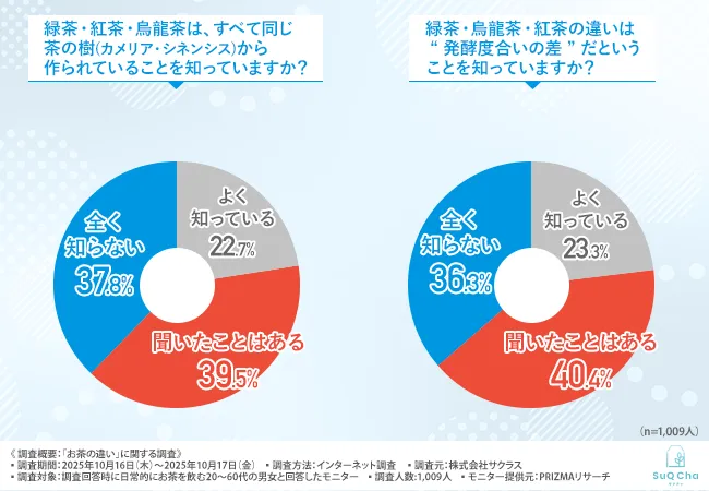 普段飲まれているお茶が同じ樹から作られていることを知っている人は少なく、調査によると「よく知っている」のは約22%。ほとんどの人が、まだその違いに対する理解が浅いのが現状です。お茶の違いの一因である発酵度合いの差に関しても、「よく知っている」と答えた人は約23%に留まりました。