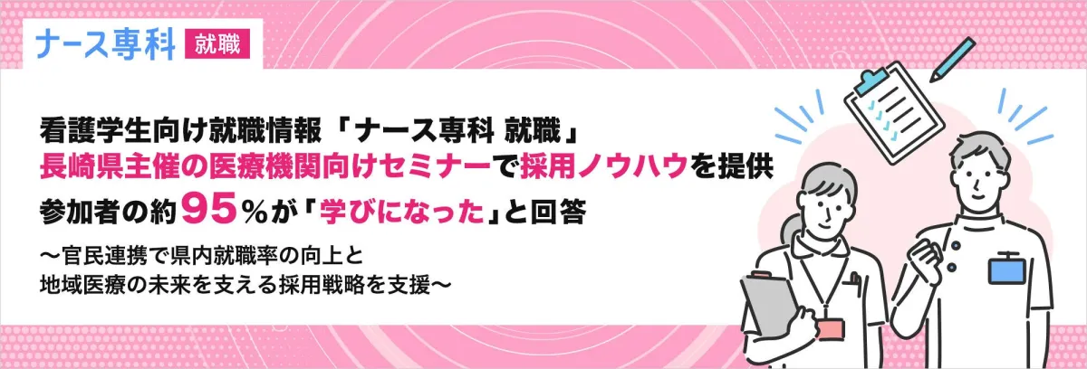 看護職員の recruitment(採用)に関して、全国的に人材の確保が難しくなっています。特に長崎県では看護学校を卒業した学生の就職者数が減少しており、県外就職を選ぶ若者も増えています。このような状況の中、長崎県が主催した「看護職員採用力向上セミナー」がオンラインで開催され、多くの医療機関が参加しました。セミナーに参加した医療機関の約95%が、内容を「学びになった」と評価し、高い満足度を得ています。