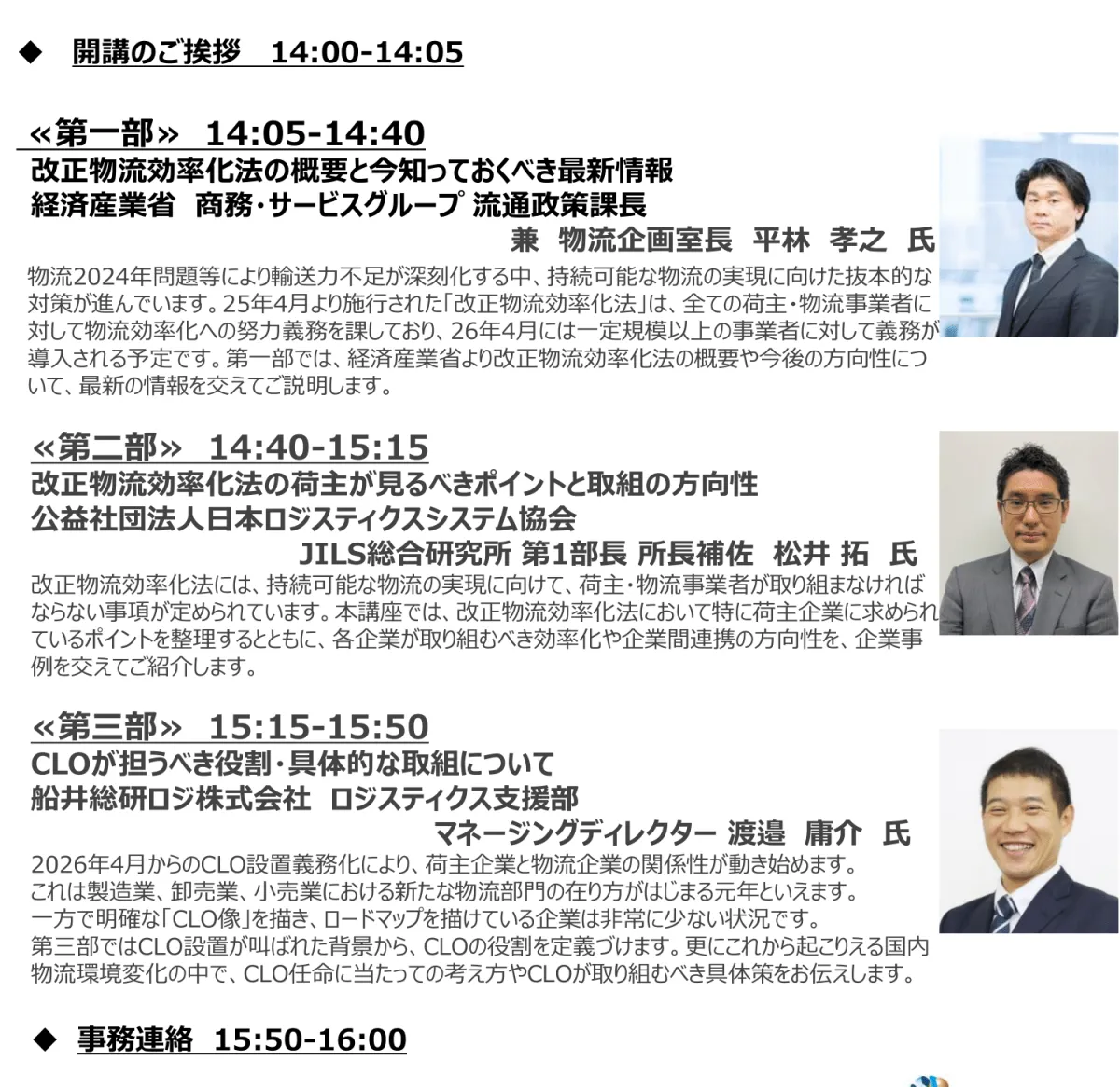このセミナーは、2025年4月に施行された「改正物流効率化法」に基づく物流業界の最新情報を提供します。具体的には、荷主企業が直面する課題、効率化のために必要な取り組み、そして企業間の連携の重要性について事例を交えながら解説していきます。さらに、2026年4月から義務化されるCLO(Chief Logistics Officer)の役割とその具体策についても触れます。