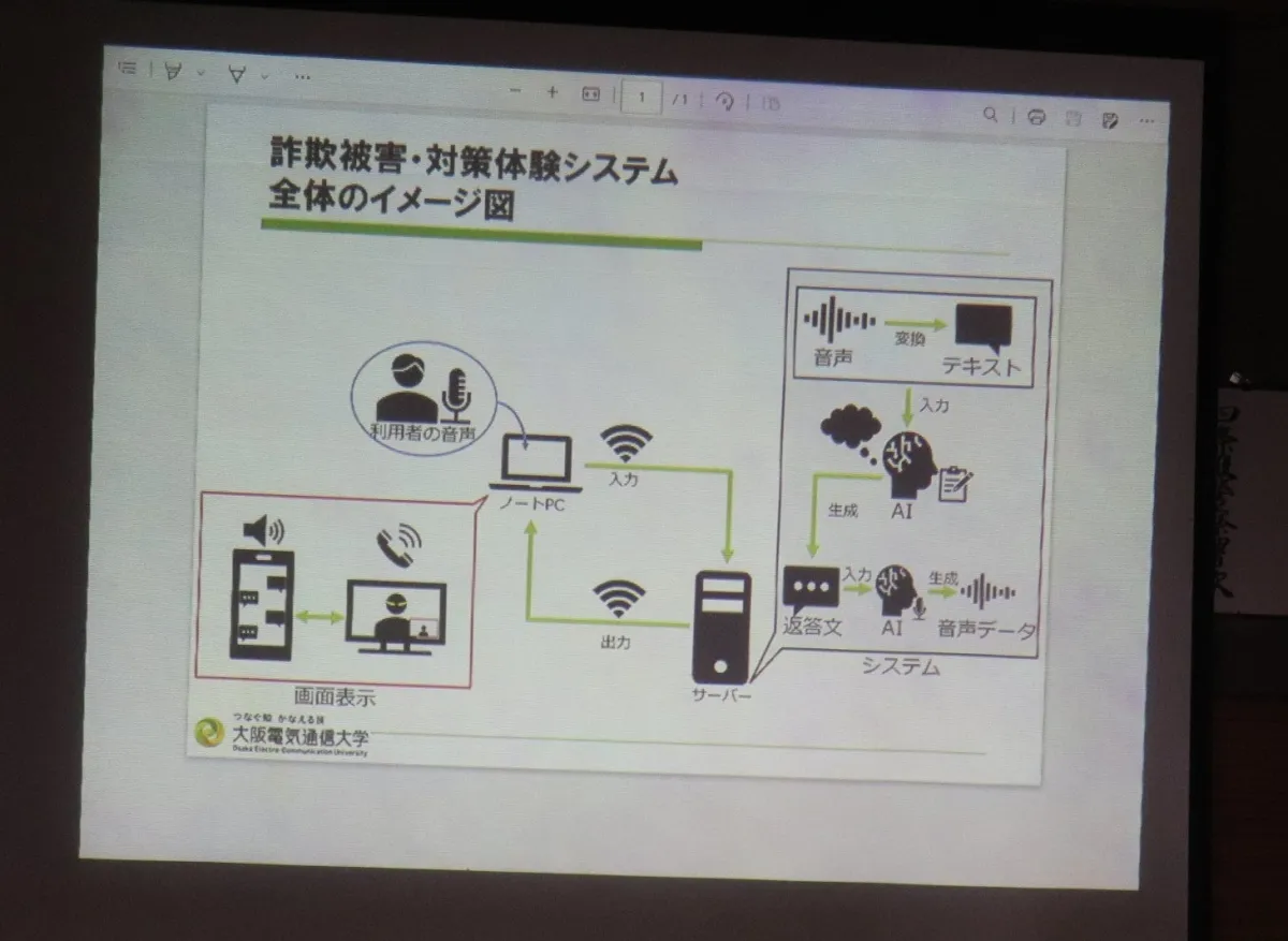 特殊詐欺体験会の中心となるのは、情報通信工学部と総合情報学部の学生たちが共同開発した特殊詐欺防止システムです。このシステムは、四條畷警察署が提供した実際の詐欺シナリオを基に構築されており、AIが詐欺師の役を演じます。参加者はこのAIとのリアルなやり取りを通じて、詐欺が発生する時の「緊迫感」や「臨場感」を体験できます。これにより、従来の紙媒体や講演会では伝わりにくい詐欺の手口や心理的な誘導技術を、直接体験しながら学ぶことが可能です。