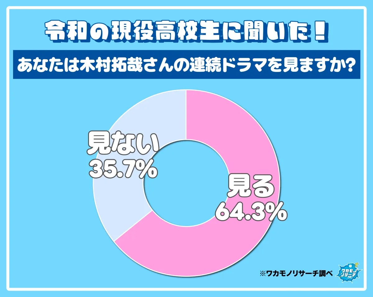 一方で、約35.7%の高校生は「見ない」と回答。多くの理由は「ドラマに興味がない」や「テレビをほとんど見ない」というもので、時代の変化を感じさせます。これは木村拓哉さんの魅力が伝わっていないというよりは、テレビ離れが影響していると言えます。
