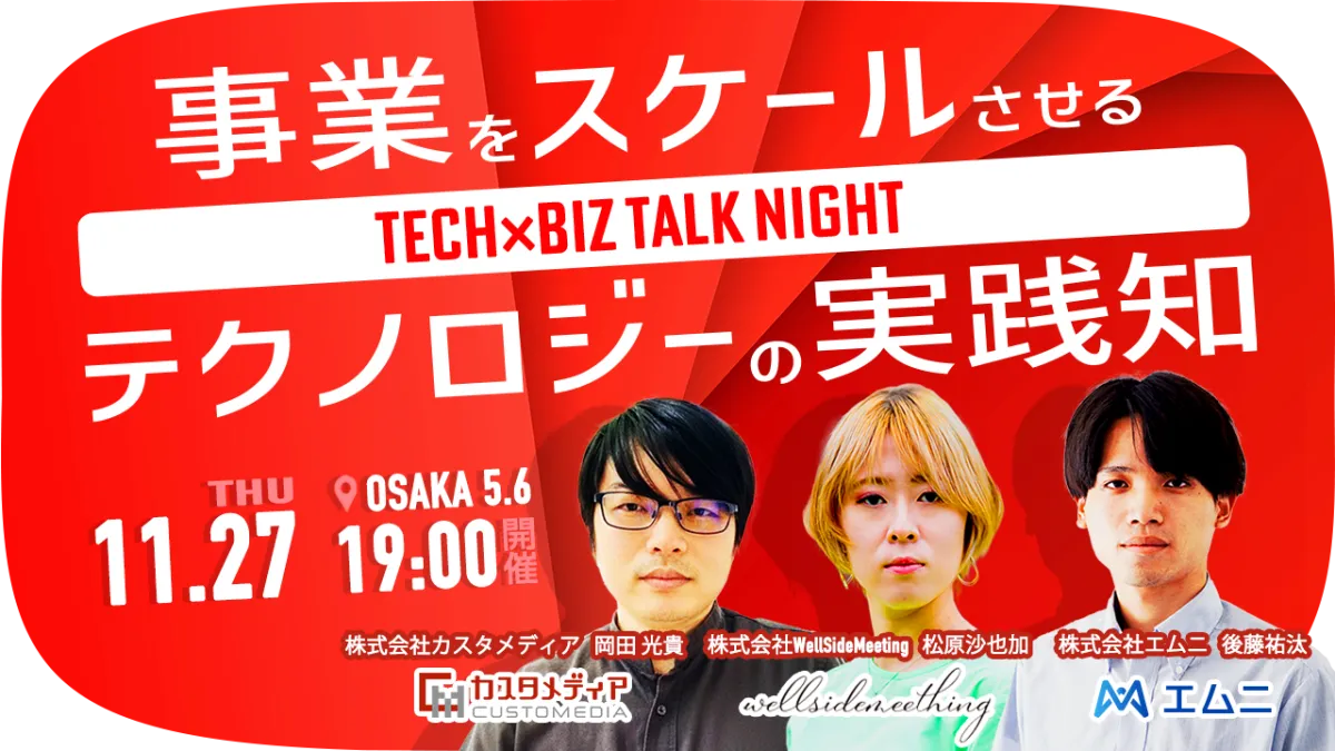 2025年11月27日(木)、大阪のコミュニティスペース5.6で「Tech×Biz Talk Night」が開催されます。主催は、大阪市北区に本社を置く株式会社カスタメディア、株式会社WellSideMeeting、及び東京都千代田区の株式会社エムニの三社です。参加は無料で、事前登録が必要です。