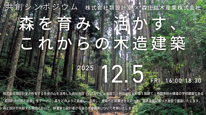 2025年12月5日(金)に、株式会社類設計室と森庄銘木産業株式会社の共同で開催される「共創シンポジウム~森を育み、活かす、これからの木造建築~」。大阪の設計業界を中心に、木造建築にかかわる方々のネットワーク形成を目指すこのイベントは、東京にある共創拠点「Root」で行われます。