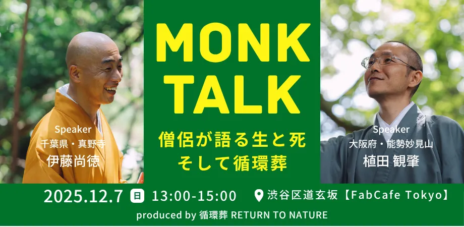 12月7日(日)、東京都渋谷区にて、「生と死の循環」をテーマにしたトークイベントが行われます。本イベントでは、循環葬を提唱する2人の僧侶が招かれます。彼らは、日本各地の寺院での経験を基に、弔いや葬送が現代でどう変わってきたのか、またそこから私たちがどのように生きるべきかについて語ります。