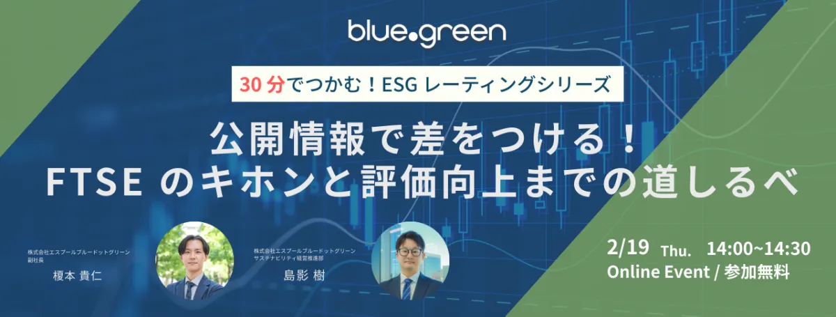 2026年2月19日(木)14:00から、株式会社エスプールブルードットグリーンが主催するオンラインセミナーが行われます。本セミナーでは、ESGレーティングの一つであるFTSEに特化し、30分でその基本と評価向上に関するポイントを分かりやすく解説します。