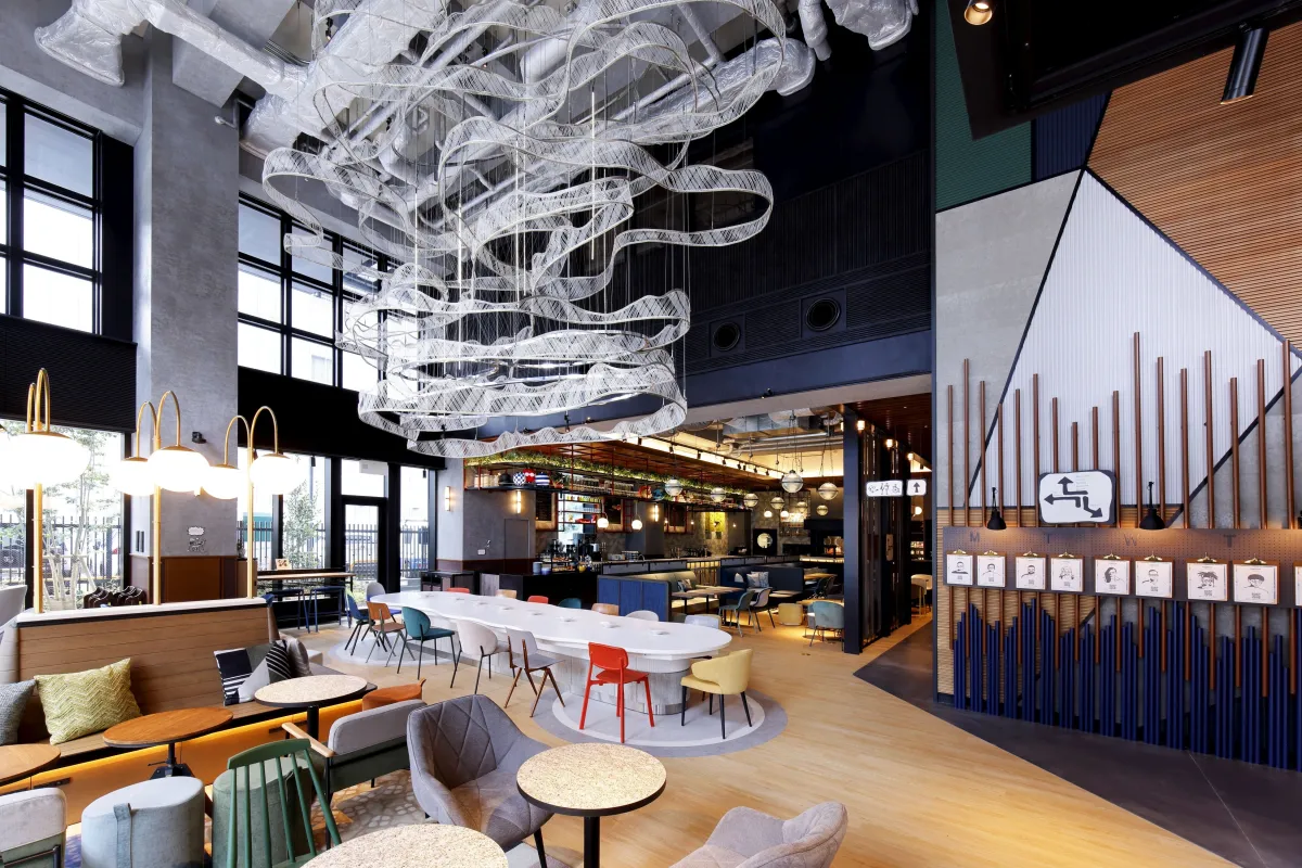 館内は、地域文化が反映された「トークショップ」と呼ばれるスペースが特徴で、地元の人々や旅行者が気軽に交流できる場を提供しています。カフェやバーでは、大阪のソウルフードと共に、映画や音楽など、多彩なイベントが常時行われています。さらに、ポップな壁面アートやユニークなインテリアが、訪れる人々に遊び心を与えています。例えば、日本刀の柄を模したデコレーションや、大阪弁を使用した案内表示など、思わず笑顔になるような細部まで工夫が施されています。