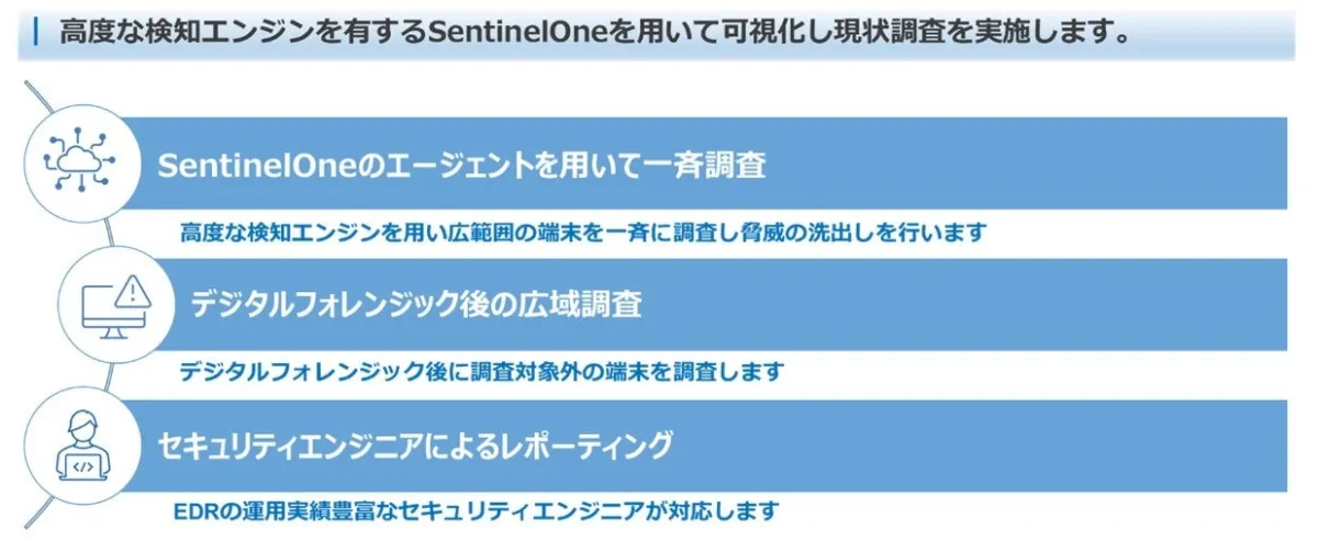 「Security-First Aid」は、エンドポイントから挙動データを短期間で収集し、分析を行います。これにより、実際に侵入があったのか、またその影響範囲はどの程度かを視覚的に把握することができます。具体的には、プロセスの実行状況、通信履歴、ファイルの操作状況を細かく調査し、潜在的な脅威の存在を明らかにします。このプロセスには、国内外で実績のあるSentinelOne社製EDR「Singularity Endpoint」を活用しており、強力な分析力を発揮します。