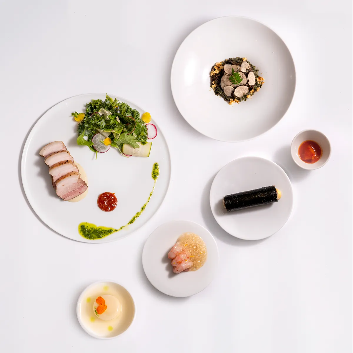 さらに、セウジャン(甘エビの醤油漬け)の上に盛られたプルコギの泡は、伝統の要素を見事に表現しています。遊び心あふれるこの一皿は、韓国料理の定義を再構築し、新たな視点を提供しています。香り高いトリュフスライスを添えた冷麺は、食材の原点にこだわった必然の組み合わせで、余韻を感じることができる一品です。