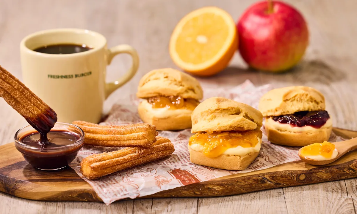 新たに導入される3種類の作りたてスコーンサンドは、その場でリベイクし、クリームチーズやフルーツジャムをサンドするスタイル。ジャムの種類は、マーマレード、ブラックチェリー、アップルシナモンの3つで、それぞれの風味がしっかりと引き立てられている。フレッシュネスはこれにより、バーガーだけでなく、コーヒーやスイーツも楽しめる「バーガーカフェ」としての魅力をさらに高めている。