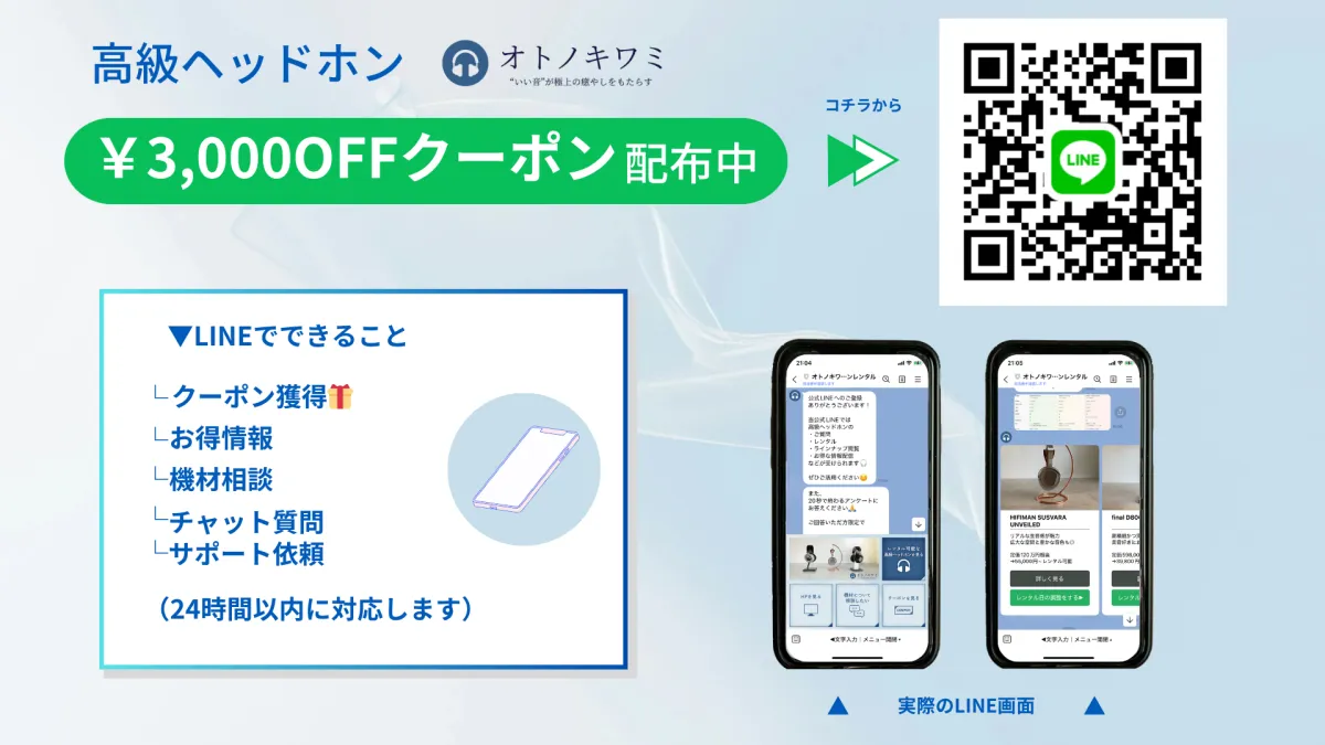 音楽好きの皆さん、自宅のリラックスした環境で高級ヘッドホンを試すチャンスです! 『オトノキワミ』を通じて、あなただけの音楽体験を見つけてみませんか? 公式LINEの登録と回答でお得なクーポンを手に入れて、心ゆくまで音楽に浸りましょう!