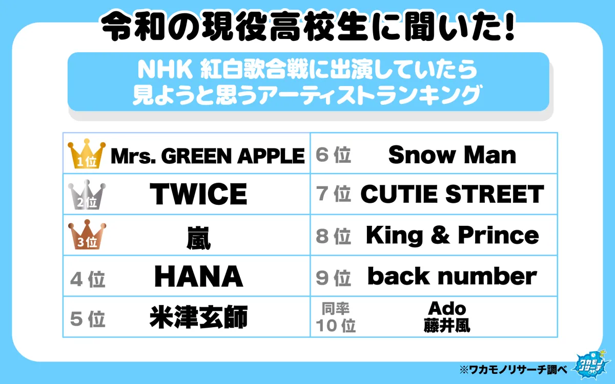 調査では、紅白に出演していたら見たいアーティストのランキングも行われました。第1位には「Mrs. GREEN APPLE」が選ばれ、彼らの人気が高校生の間でも非常に高いことが示されました。「好きな曲が多く、ライブにも行ったから」というファンの熱量が伝わります。また、2位には「TWICE」、3位には「嵐」が選ばれており、それぞれの背後には共感する熱心なファンの存在があります。