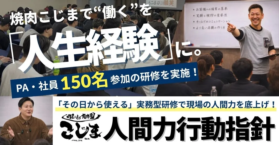 今回は、ただのスキルアップにとどまらず、焼肉こじまが推進する独自の教育システムである「人格力×接客力」を採用。「人が辞めない組織」「再現性のある高品質サービス」を実現するため、社員一人ひとりの成長に焦点を当てています。この研修は、現在の飲食業界が抱える深刻な人材不足や離職率の問題に対する明確な回答として位置づけられています。