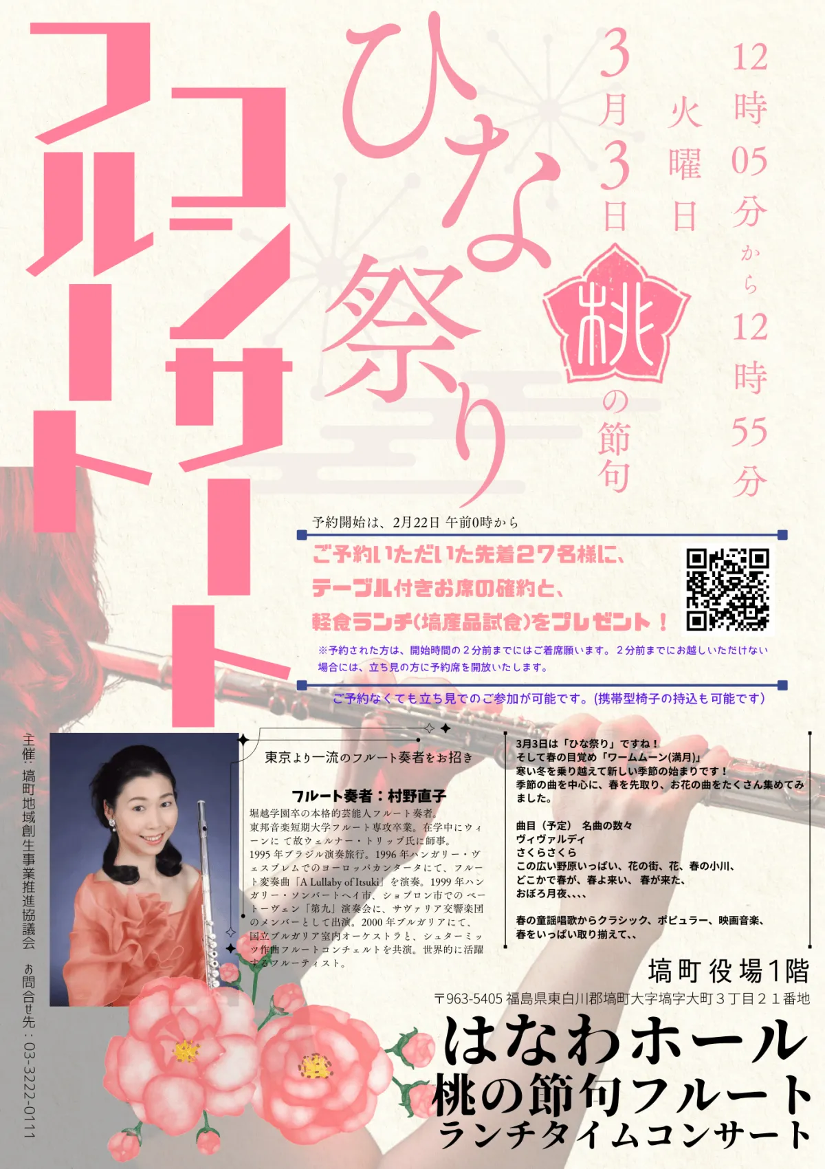 春を迎えるこの特別な機会に、美しい音楽と共に塙町の味わいを楽しんでみてはいかがでしょうか。新しい季節を共に祝い、心地よいひとときを過ごしましょう。皆さまのご来場を心よりお待ちしています。