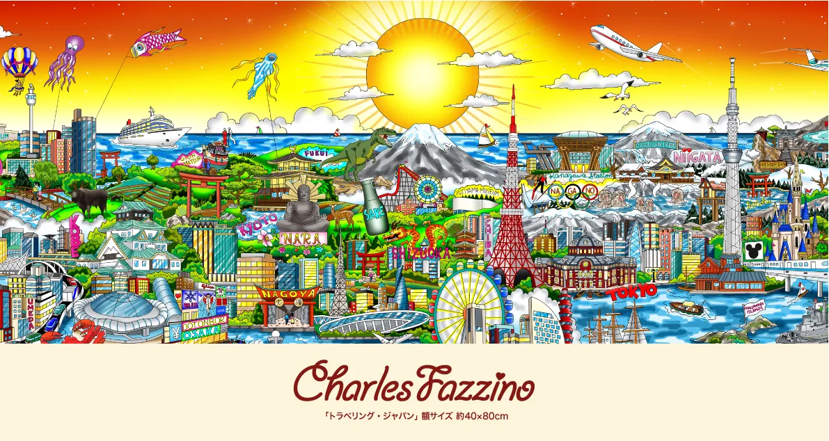 会場では、ファジーノの代表作や新作を含む多彩な作品が展示されます。中でも注目は、「トラベリング・ジャパン」という作品で、サイズは約40×80cm、価格は396,000円(税込)です。日本をテーマにしたこの作品は、観る人を旅へと誘うような魅力があります。