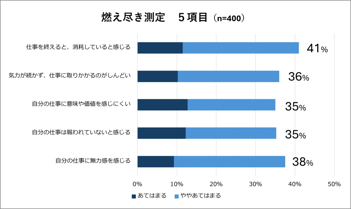 タバネルは、課長の燃え尽き状態が企業のパフォーマンスや精神的健康にどのような影響を及ぼすかを分析するため、全国400人の課長に対する実態調査を行いました。調査の結果、課長の燃え尽き度を示す5つの項目において、「あてはまる」「ややあてはまる」と回答した割合がすべて35%を上回りました。