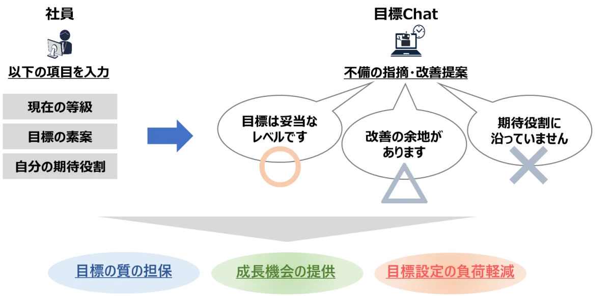 このツールは「壁打ち役」のように機能し、社員が自分で作成した目標案を洗練するのを助けます。目標設定の過程で論理的思考や抽象化といったスキルを自然に養うことができます。
