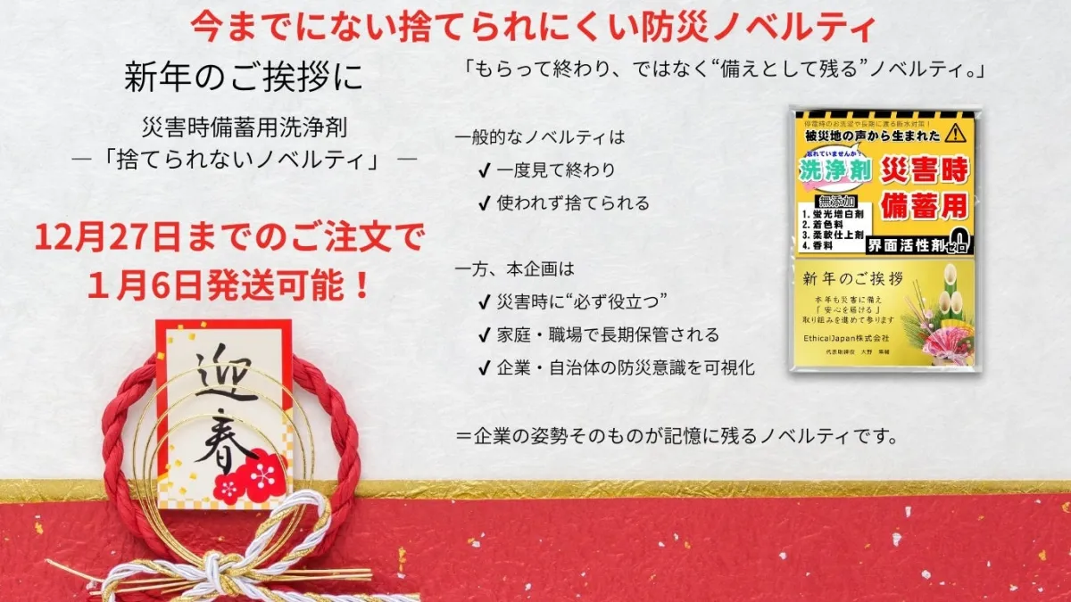 災害時に必要な備蓄品といえば、水、食料、トイレ対策が一般的ですが、実は「洗濯」や「清潔を保つこと」も重要な課題です。これまで多くの災害備蓄はこの盲点を見逃してきました。しかし、EthicalJapan株式会社が発表した「捨てられない防災ノベルティ」は、そんな新たな視点から防災対策を提案します。