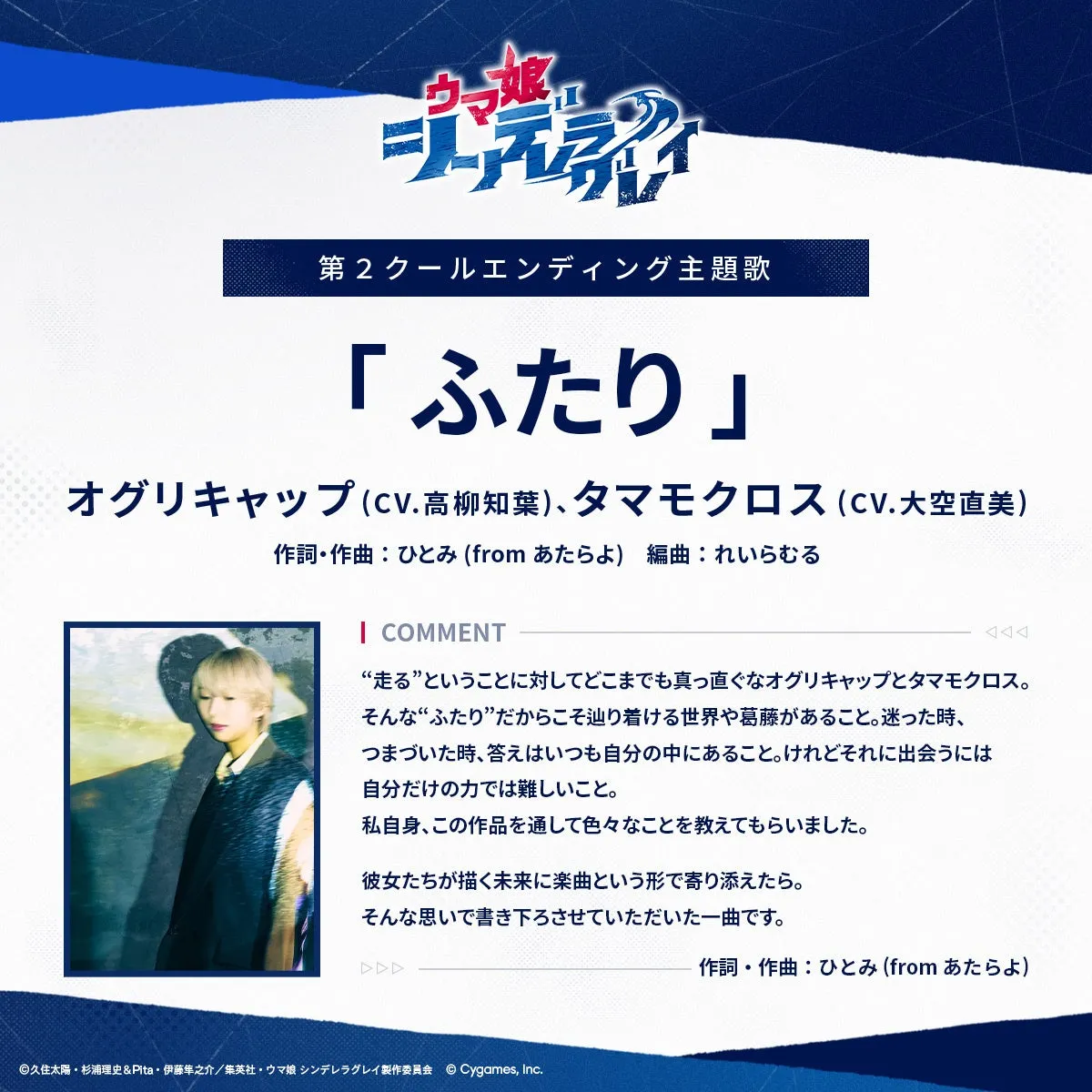 作詞・作曲を担当したのはあたらよのひとみさん。彼女は「オグリキャップとタマモクロスは、走ることに対して非常に真摯な姿勢を持っている。その中で得られる葛藤や成長の過程を、この曲を通して感じてほしい」と語っています。