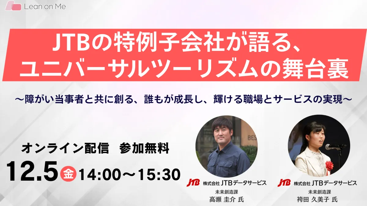 株式会社Lean on Meが主催するオンラインセミナー"JTBの特例子会社が語る、ユニバーサルツーリズムの舞台裏"が、2025年12月5日に開催されます。このセミナーはホテルやテーマパークを運営する方々や、障がい者雇用の推進を考える企業人事担当者を対象にしています。参加は無料で、事前登録が必要です。