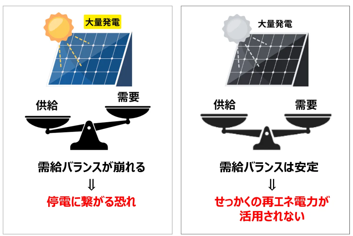 太陽光発電や風力発電は、その特性上、天候による発電量の変動が大きいのが難点です。特に、晴れの日には発電量が需要を上回ることが多く、これにより余剰電力が発生します。この電力を活用しきれない「もったいない」現象が再エネの普及を阻む要因となっています。