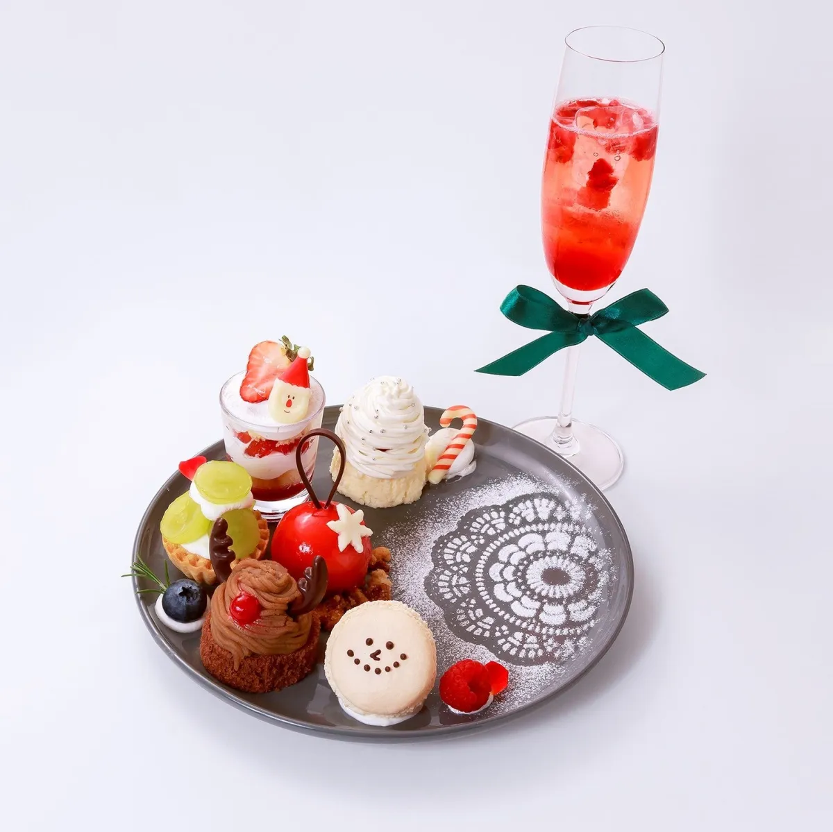 「クリスマスプレート」には、いちごのカップケーキ、シャインマスカットのタルト、モンブラン、キャラメルマカロン、チーズケーキ、りんごのムースといったバラエティ豊かな6種類のミニケーキが盛り込まれています。見た目も華やかな盛り付けで、目でも楽しめる一品です。これだけの種類を一皿で楽しめるのは、クリスマスだからこそ!