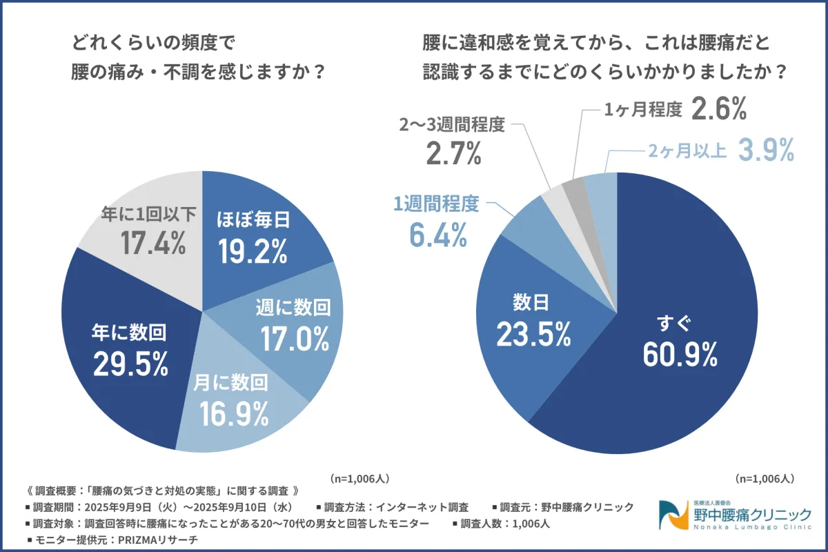 大阪にある野中腰痛クリニックが実施した「腰痛の気づきと対処の実態」に関する調査において、興味深い結果が得られました。調査対象は腰痛に悩んだことがある20代から70代の男女1,006名。