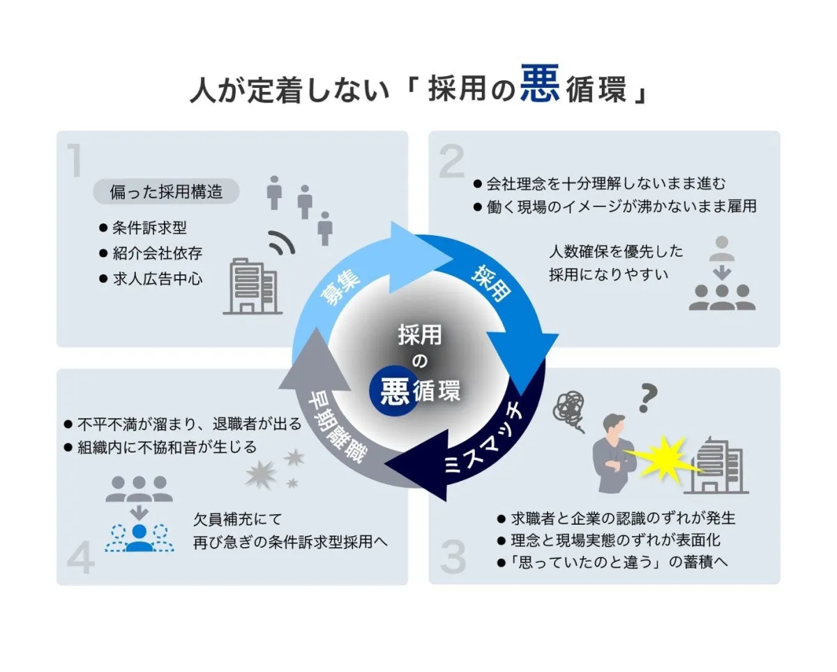 今、求められているのは「採用数」だけでなく、「構造」の見直しです。多くの事業所では求人広告や条件改善といった短期的な対策が行われていますが、これでは根本的な解決には至りません。事業所が明確なビジョンを持ち、理念を共有できなければ、採用→ミスマッチ→早期離職という悪循環から抜け出すことはできないのです。