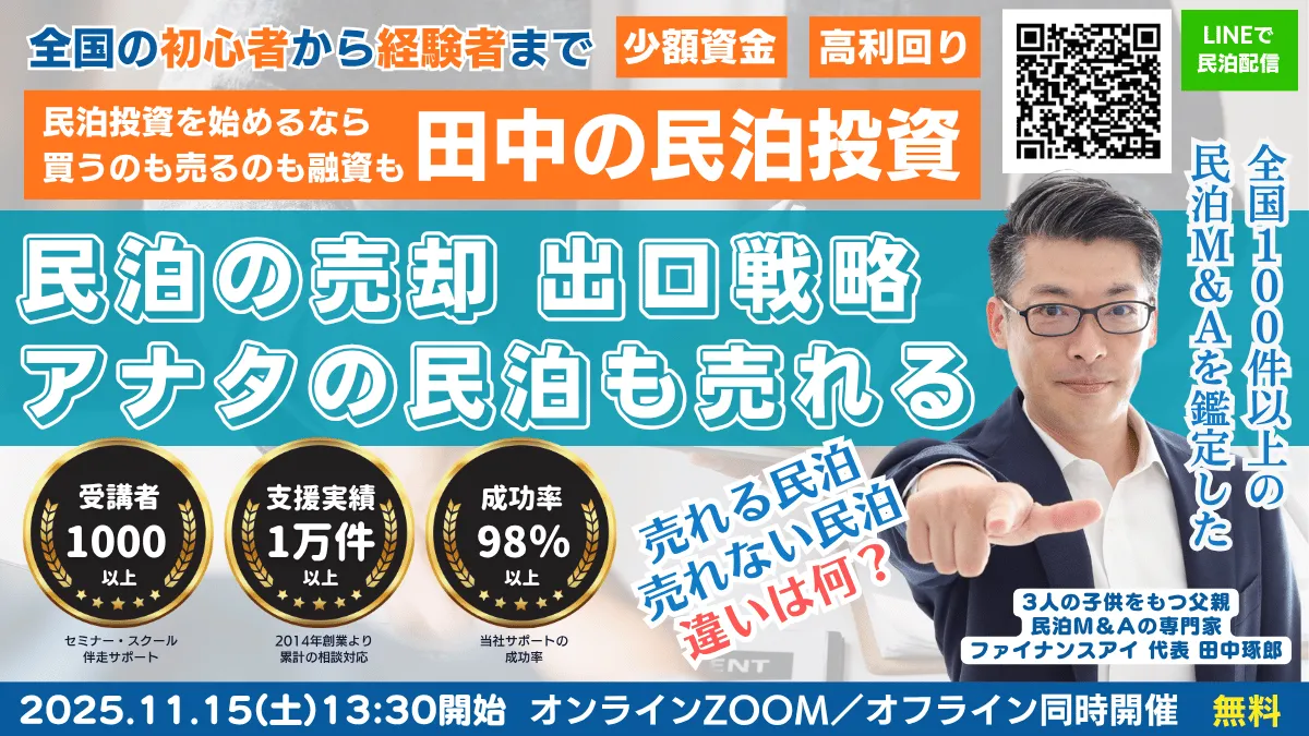 大阪市の株式会社ファイナンスアイが、民泊運営者からの注目を集めるセミナーを開催します。このセミナーでは「物件なしでも民泊を売却できる」新たな出口戦略や、M&Aを通じての高額売却について詳しく解説されます。2025年11月15日(土)には、日本全国から参加可能なオンライン形式と、現地会場での実施が予定されています。まずは、基本情報からご紹介します。