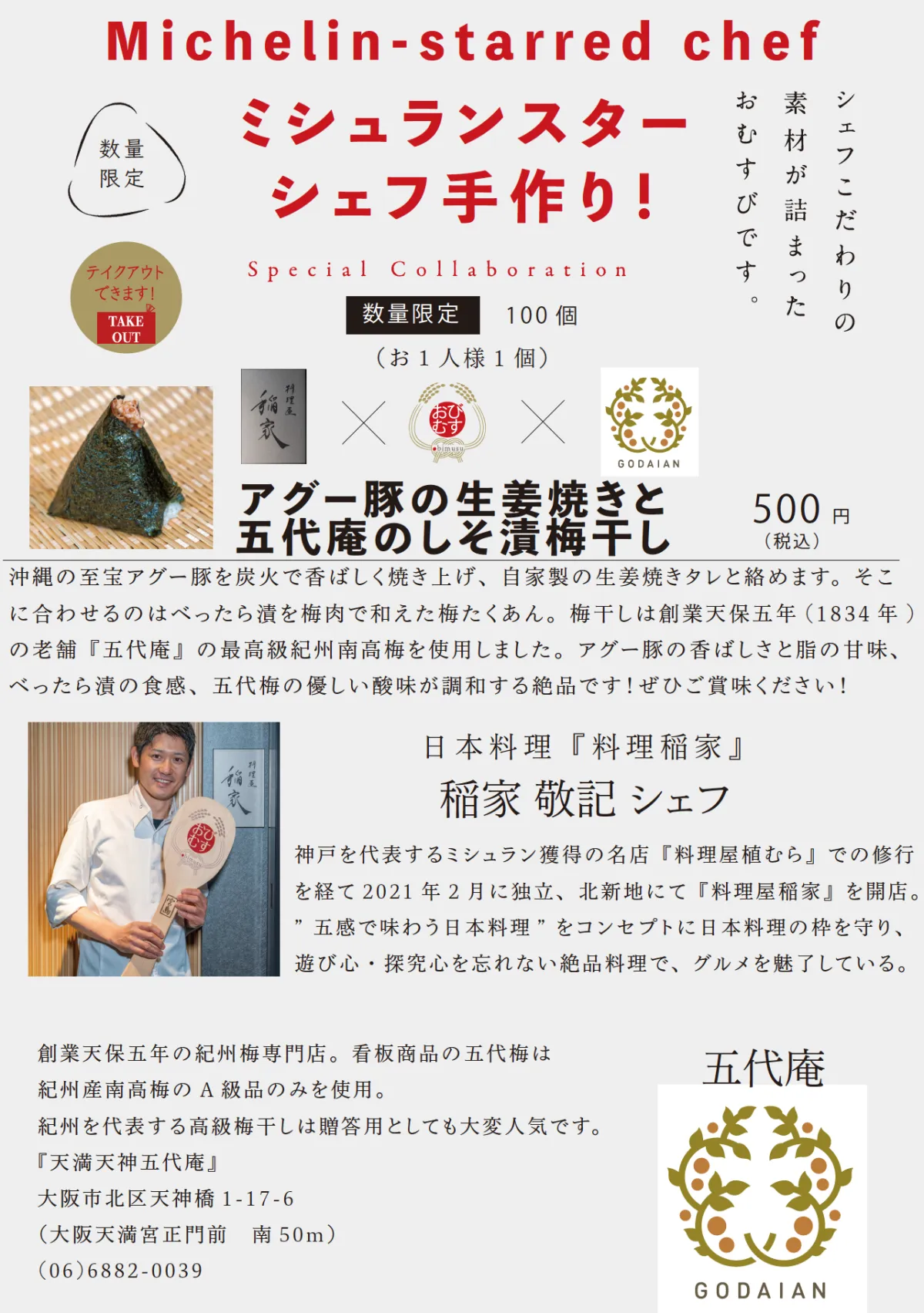 今回、『おびむす』で提供されるのは、北新地の『料理屋 稲家』の稲家敬記シェフが作り上げた「アグー豚の生姜焼きと五代庵のしそ漬け梅干しのおむすび」です。このおむすびは、2023年12月5日から販売開始され、数量は100個の完全限定。お一人様一つまでの提供となるため、その希少性がさらに食欲をそそります。