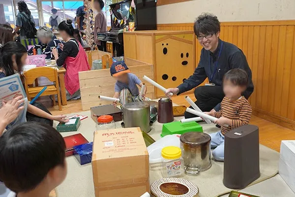 イベントの会場にはたくさんのお子様やそのご家族が集まり、子どもたちは楽しそうに太鼓遊びに興じていました。また、小野寺さんによる生ギター演奏が行われ、参加者たちはそのメロディに合わせて一緒に歌ったり、セッションを楽しんだりしました。音楽が溢れる中、子どもたちの笑顔が弾けているのはとても印象的でした。