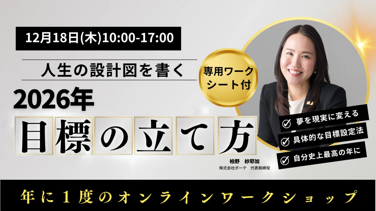 2025年には新たな飛躍が期待される中、大阪市に本社を置く株式会社ボーテの代表、柏野紗耶加氏が主催するオンラインワークショップ、「人生の設計図を書く!2026年目標の立て方」が開催されます。このセミナーは、Forbes JAPAN WOMEN AWARD 2025で第4位を受賞した実績を持つ柏野氏の知識を直接学べる貴重な機会です。