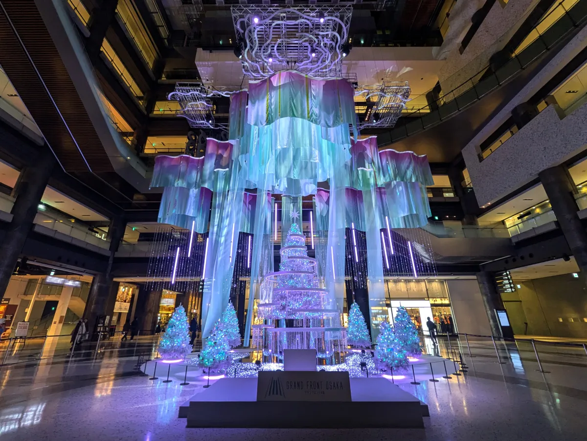 次は、グランフロント大阪北館1Fナレッジプラザで開催される「GRAND WISH CHRISTMAS 2025」。こちらは11月6日から12月25日までの期間で、テーマは「Winter Prism」。幻想的なオーロラをイメージしたツリーは、光のベールが揺らめく様子が訪れる人々を包み込むかのようです。美しい輝きが、特別な瞬間を演出します。