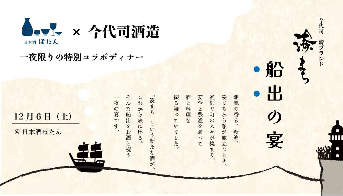 2025年12月6日、大阪市福島にある日本酒専門店「ぽたん」で行われる特別イベント「湊まち 船出の宴」。これは、新潟の今代司酒造が手がける新ブランド「湊まち」とのコラボレーションイベントです。この貴重な機会に、皆さんを誘致したいところです。