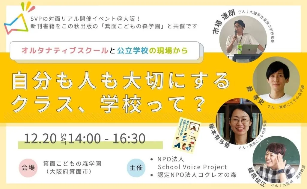 2025年12月20日(土)、大阪府箕面市で新刊「自分も人も大切にする学校の12か月」の出版記念イベントが行われます。このイベントでは、オルタナティブスクール「箕面こどもの森学園」と公立小学校「長原小学校」の現場から、互いに尊重される学びの実践について学ぶ特別な対談が行われます。