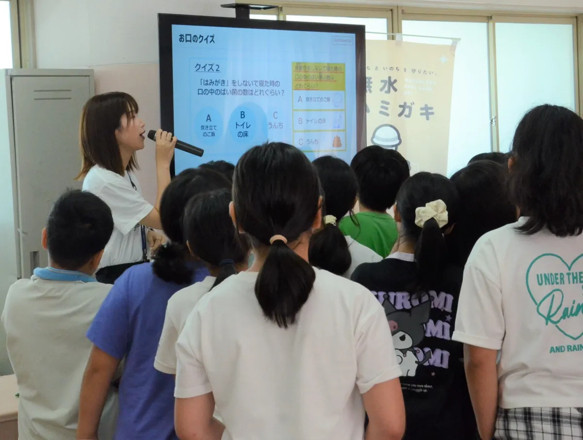 本授業は、ヤマトエスロンが八尾市と結んでいる地域貢献の一環で、平常時や非常時における口腔ケアの重要性を小学生にもわかりやすく伝えることを目的としています。授業では「お口のクイズ」が全6問用意され、参加者が積極的に取り組む様子が見られました。友達同士での競争の中、子どもたちは楽しみながら知識を深めていました。