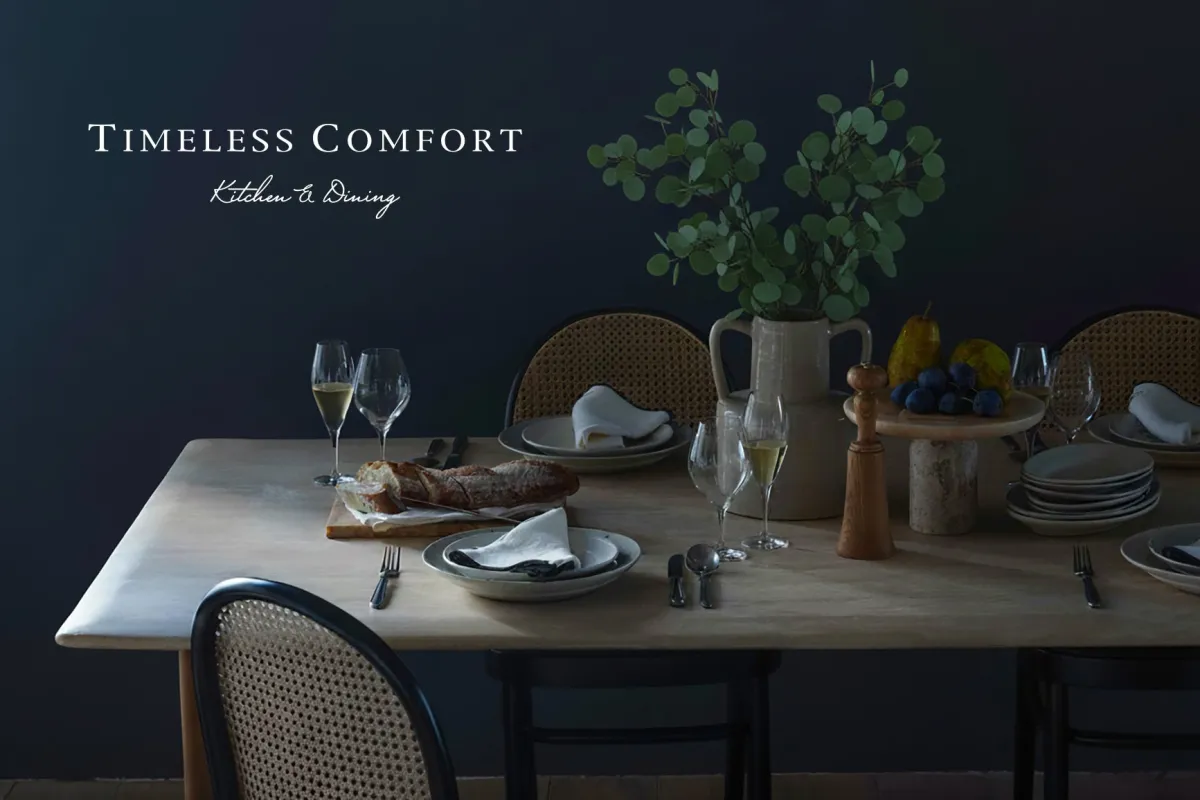 私たちは、“心地よい日常”を作るためのアイデアとセンスが溢れるショップを通じて、皆さんの日常をより素晴らしいものにできることを願っています。皆さんの生活が、TIMELESS COMFORT Kitchen & Diningで満たされることを楽しみにしています。