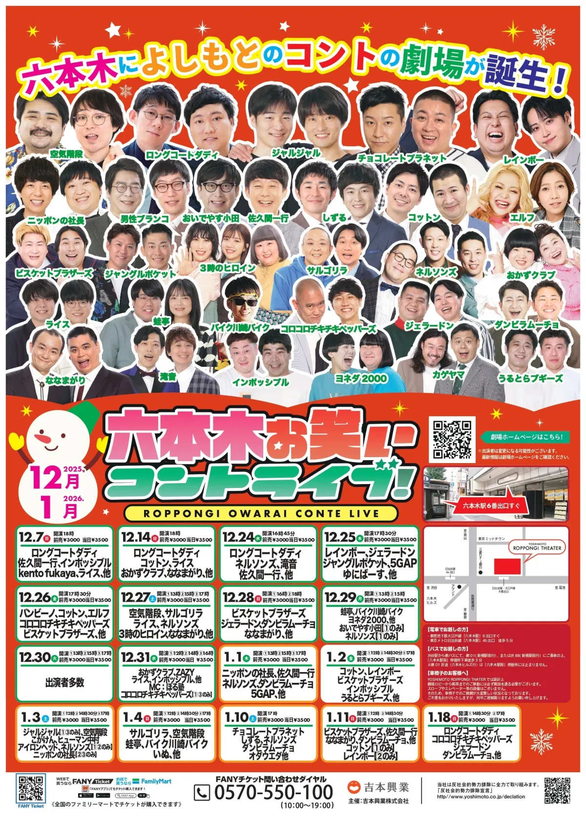 今年の7月にグランドオープンしたYOSHIMOTO ROPPONGI THEATERで、待望のレギュラー公演「六本木お笑いコントライブ!」が12月7日(日)に始まります。この公演は、若手から中堅、そして実力派のコント師が一堂に会し、90分間にわたって多彩なネタを披露するライブイベントです。この劇場ならではの豪華ラインアップに期待が高まります。