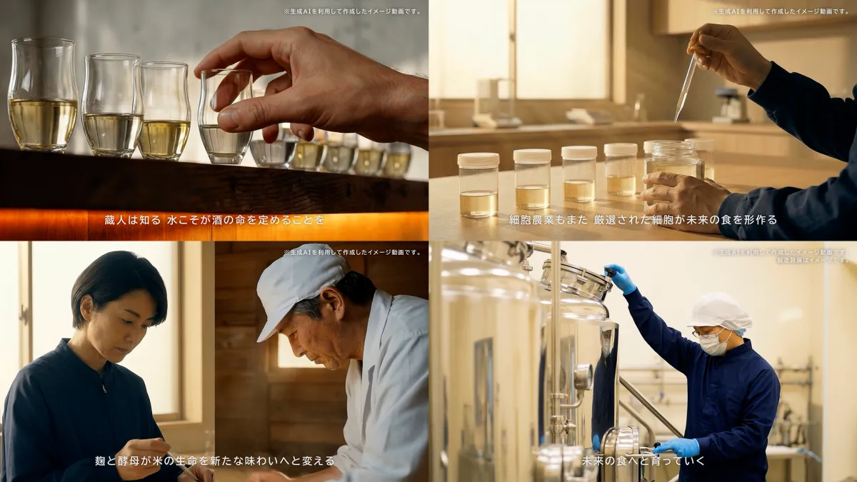 また、酒蔵の比喩を用いることで、細胞農業の抽象的な価値を直感的に理解しやすい形に変換しています。このアイデアにより、観客は複雑な概念を体感として感じることができ、映像の印象を増幅させています。