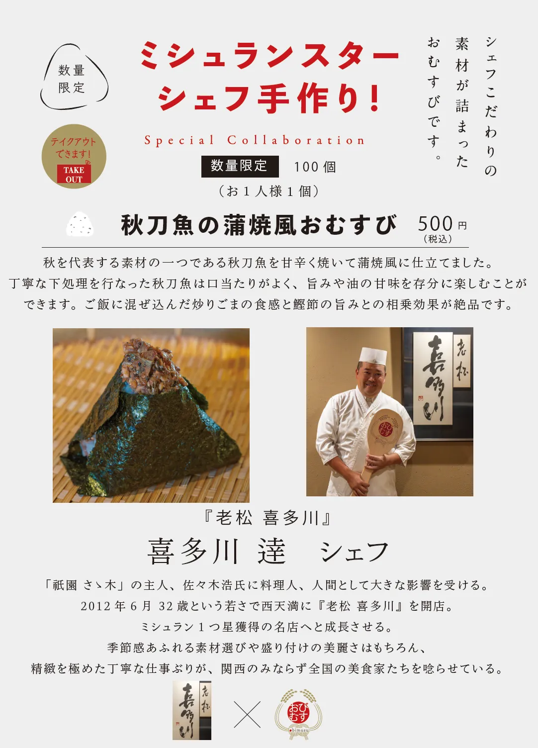 このおむすびは、西天満の『老松 喜多川』で知られる喜多川逹シェフが手がけたもので、10月10日から完全に数量限定で100個、1個あたり500円で販売が開始されます。喜多川シェフは12年連続でミシュランガイドで一つ星を獲得している名料理人であり、その技術とセンスが生きたおむすびは一見の価値があります。