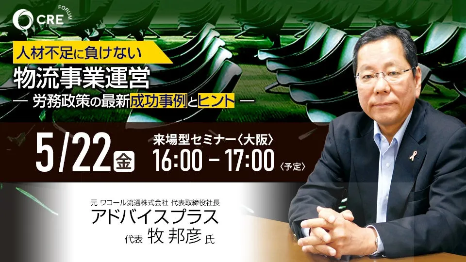 2026年5月22日(木)、株式会社シーアールイー(CRE)が主催する無料来場型セミナーが、大阪市にて開催されます。このセミナーは「人材不足に負けない物流事業運営 ― 労務政策の最新成功事例とヒント ―」をテーマに、物流業界が直面する重要な課題を共有し、解決策について深く考察する場となります。