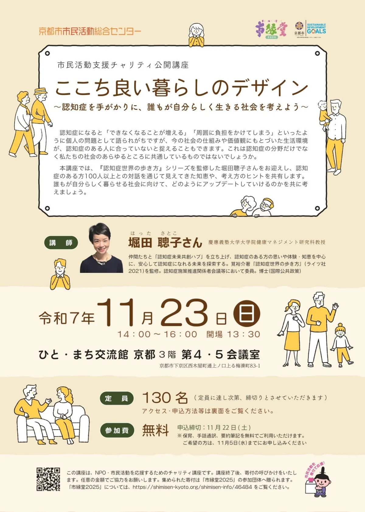 京都市市民活動総合センターが主催するチャリティ公開講座「ここち良い暮らしのデザイン」が、2025年11月23日(日)に開催されます。このイベントは、認知症をテーマに据え、誰もが自分らしく生きる社会について考えるものです。講師として、認知症に関する多くの知見を持つ堀田聰子氏をお迎えします。