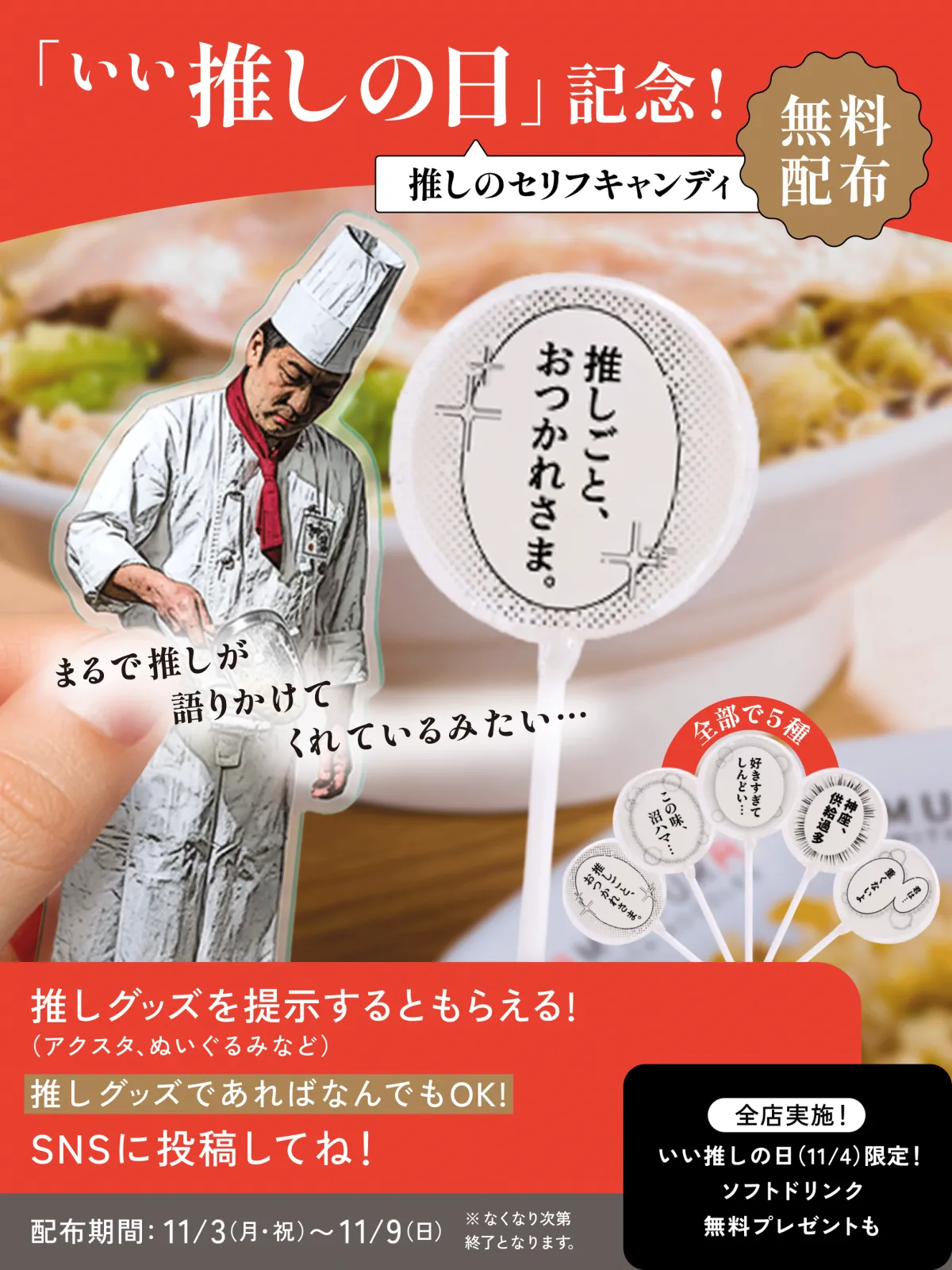 「かむくらの神推し!」では、推し活のグッズを持参した方に特別サービスが用意されています。例えば、アクリルスタンドやぬいぐるみ、チェキ、ペンライトなどの推し活アイテムを提示すると、ソフトドリンクを一杯プレゼント。11月4日のみの特別なサービスなので、ぜひ推しと一緒にご来店ください。